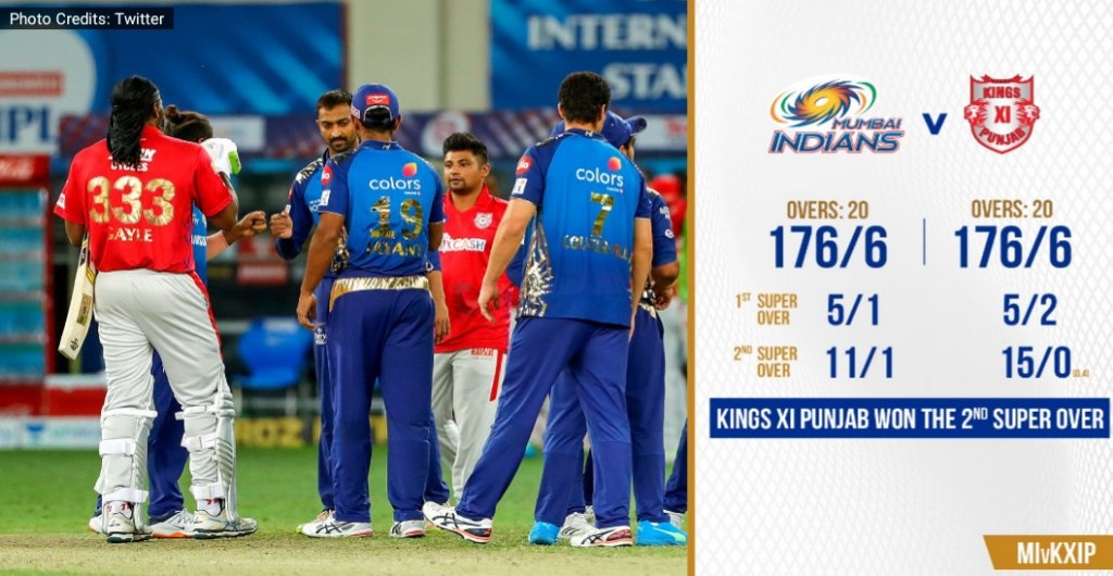 हैरान करने वाली बात ये रही कि मुंबई और पंजाब के बीच खेले गए सुपर ओवर में भी मुकाबला टाई रहा, क्योंकि दोनों टीमें 5-5 रन ही बना सकीं। ऐसे में मुकाबले का परिणाम निकालने के लिए एक बार फिर से सुपर ओवर का सहारा लेना पड़ा। उस सुपर में किंग्स इलेवन पंजाब ने बाजी मारी।